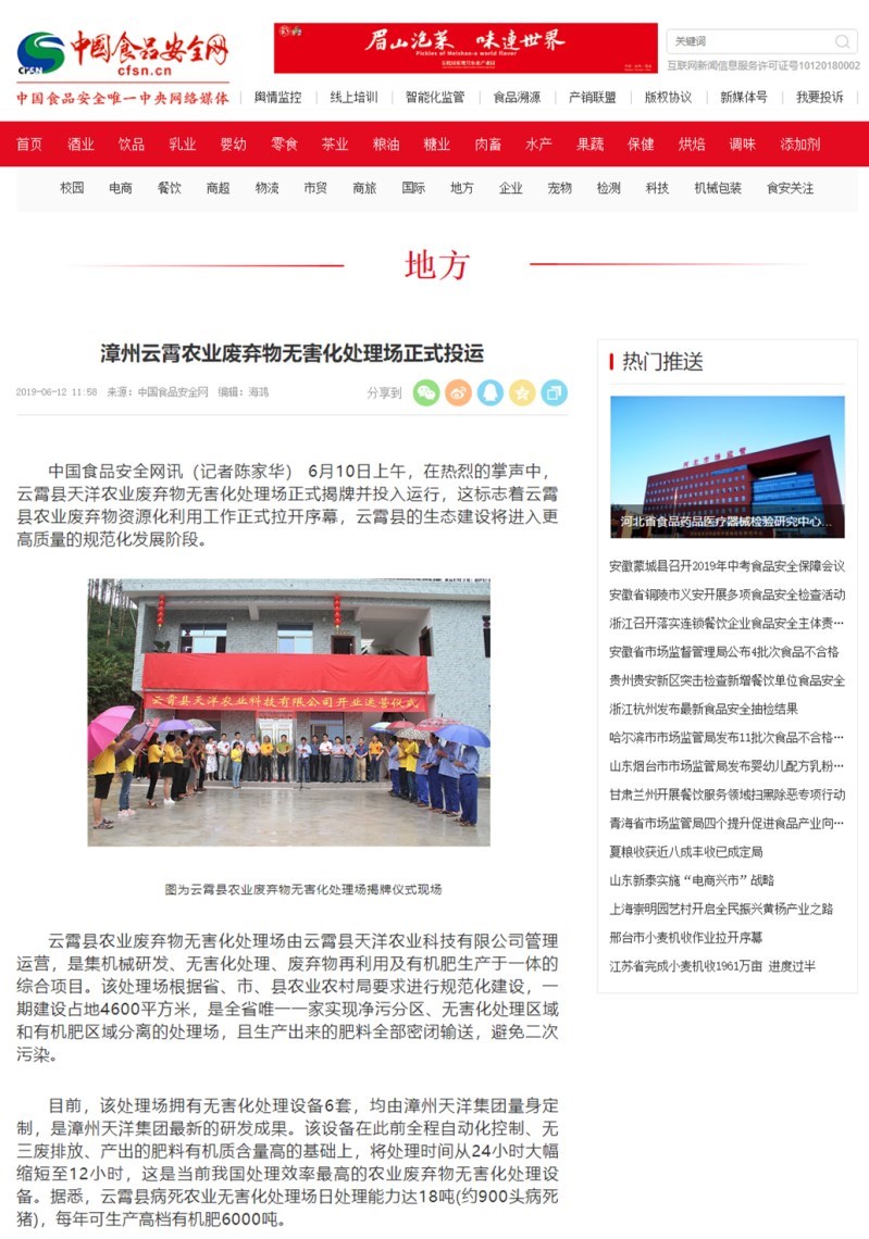 截至目前,漳州天洋集團的農業(yè)廢棄物無害化處理設備已遍布全國大部分省市,近千臺的設備日處理農業(yè)廢棄物(豬、牛、羊等)達上千噸,成為我國農業(yè)廢棄物資源化利用和無害化處理行業(yè)的引領者。